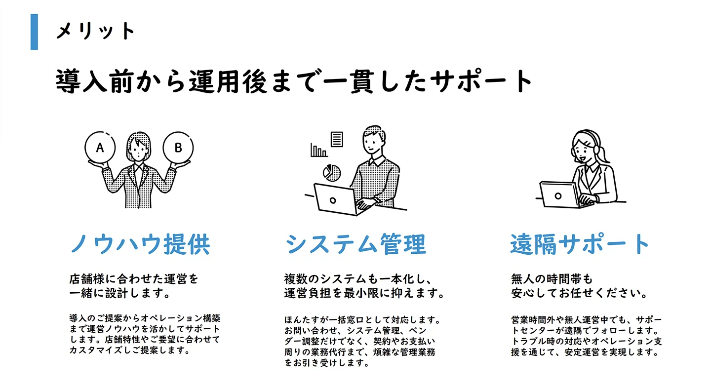 機器が揃えば無人店舗はできますが、重要なのは、それらを駆使していかに収益を生むオペレーションを構築するか、そのサポートまでできるのが我々の最大の強みです。